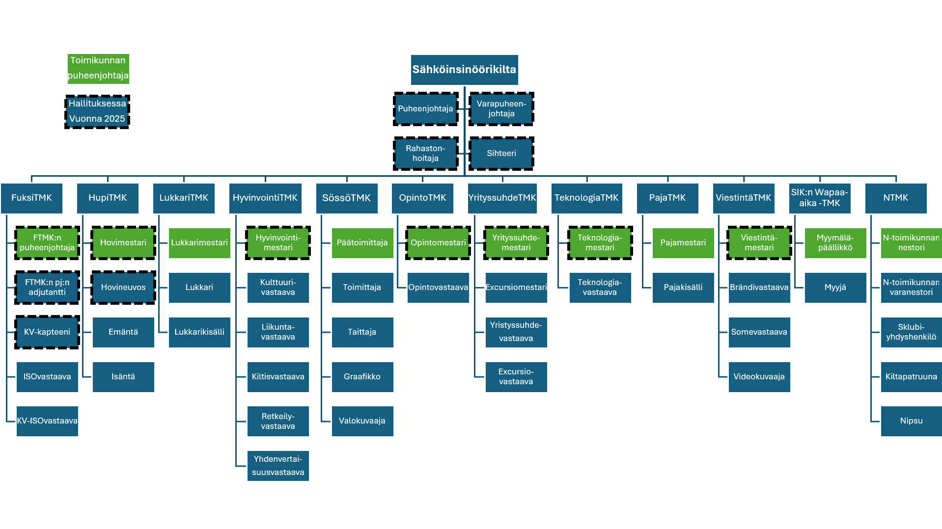 Toimikuntia on vuonna 2025 sähköinsinöörikillassa 13, joissa on yhteensä 97 toimihenkilöä eli tuttavallisemmin ”toimaria”. Yllä esitettyjen toimikuntien lisäksi killassa on Potentiaalin Tasaus -toimikunta, johon on erillinen haku. Toimikuntien rakenne ja erinäiset toimaritittelit elävät toki vuodesta toiseen. Sama henkilö voi toimia useammassa toimihenkilöpestissä.